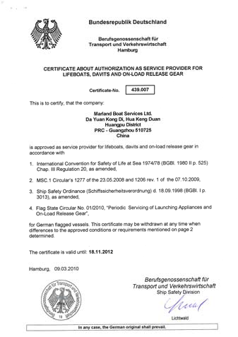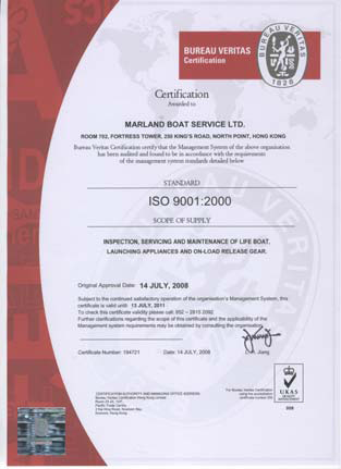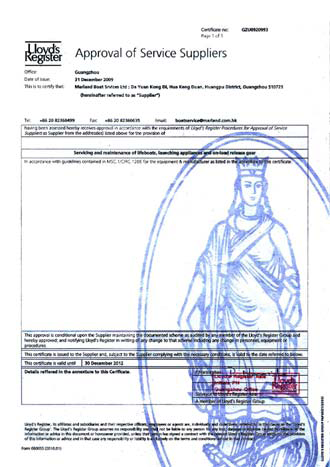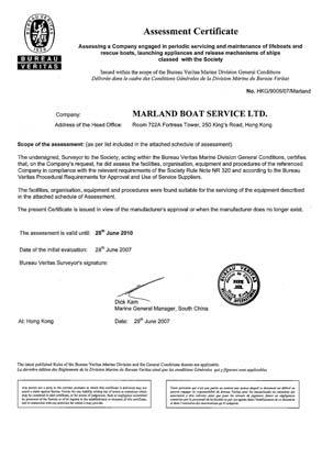 Marland Boat Service Ltd/ Hong Kong SAR, China, are specialized in servicing of lifeboats & davits, in compliance to the regulation MSC 1/Cir 1206 SOLAS Chapter III,